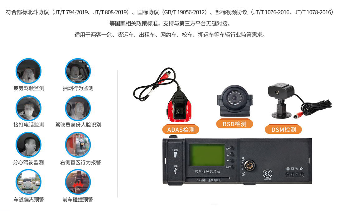 产品概述:一款采用符合标准单DIN结构设计,支持音视频录像、行驶数据记录、IC卡登签、数据打印、实时监控等功能的4G车载视频终端。符合GB/T 19056-2012、JT/T 794-2019、JT/T 808-2019、JT/T 1076-2016、JT/T 1078-2016